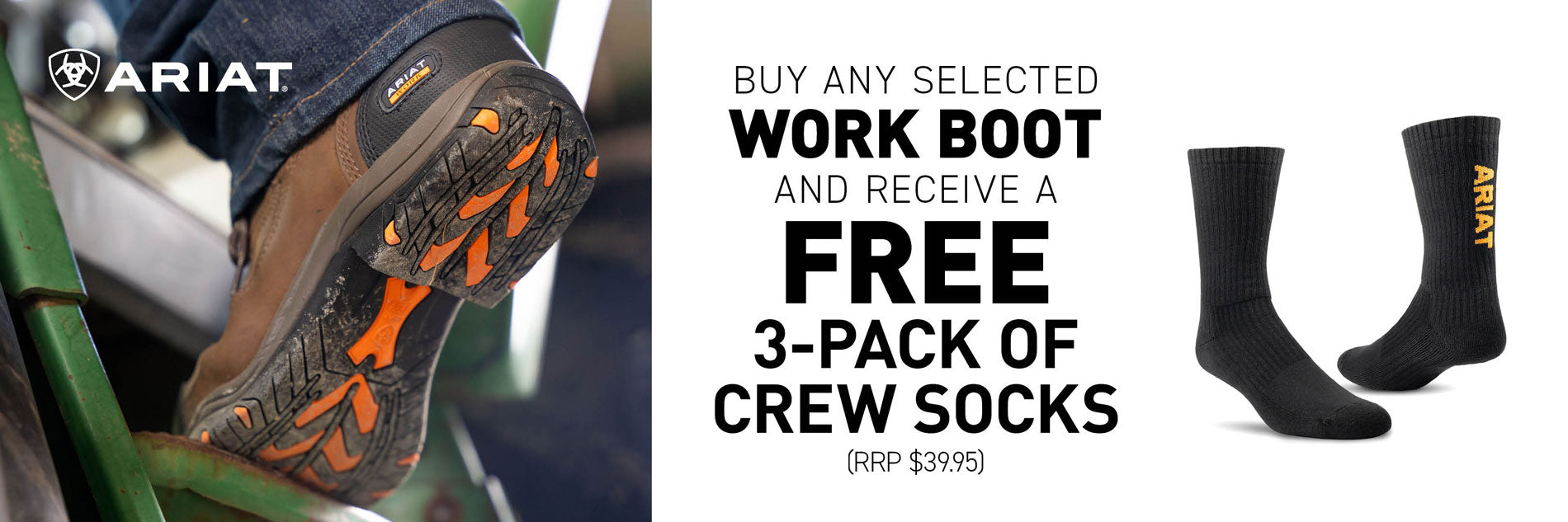 (6)- The gear you need to get the job done is here, with special back to work offers at Ariat. Get a free 3 pack of Crew Socks (2239-002) when you buy a selected pair of workboots.